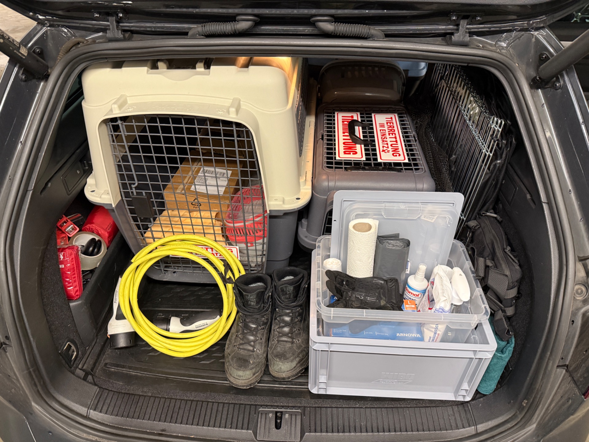 - Ausrüstung und Einsatzmaterial (z.B. Kescher, Netzpistole, Handschuhe, Desinfektion, Transportboxen, etc.)